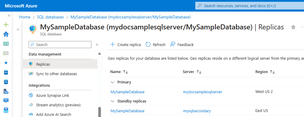 方法と手順については、「 チュートリアル: アクティブ geo レプリケーションとフェールオーバーを構成する (Azure SQL Database)」を参照してください。