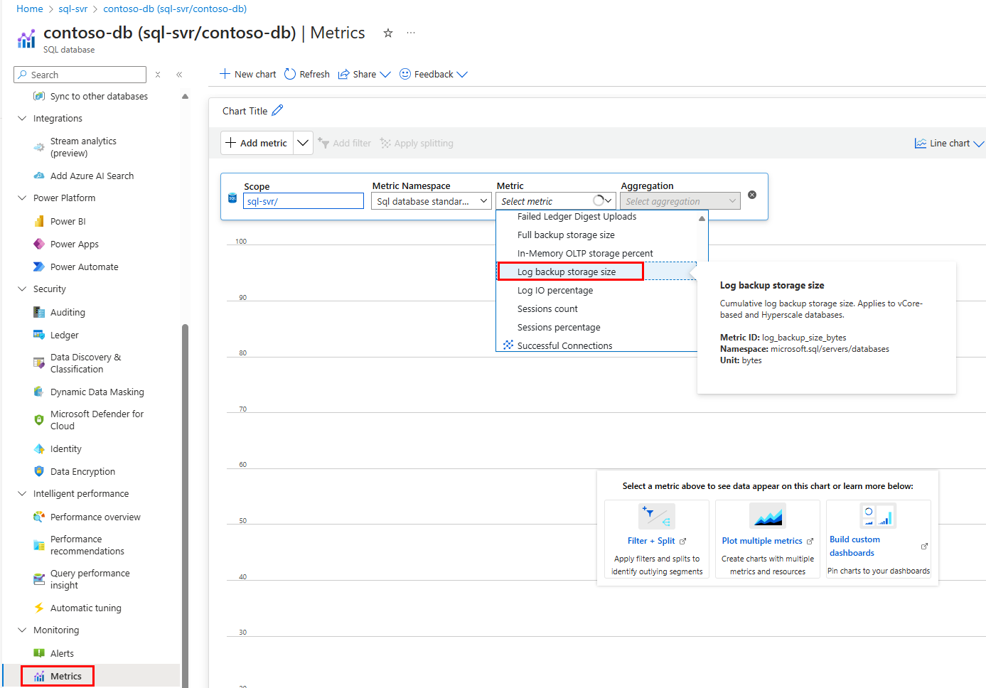 LTR バックアップのコストを監視するには、ドロップダウン リストで、単一データベースまたはエラスティック データベース プールの [LTR バックアップ ストレージ] を選択します。 測定値は、バックアップ ストレージの消費量が存在する場合にのみ表示されます。