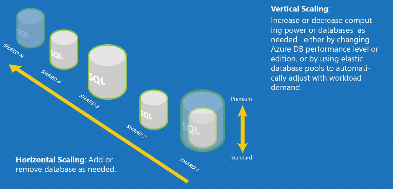 垂直スケーリング:個々のシャードのコンピューティング サイズをスケール アップ (またはダウン) する操作。 たとえば、シャードを Standard から Premium に変更 (結果、コンピューティング リソースが増大)。