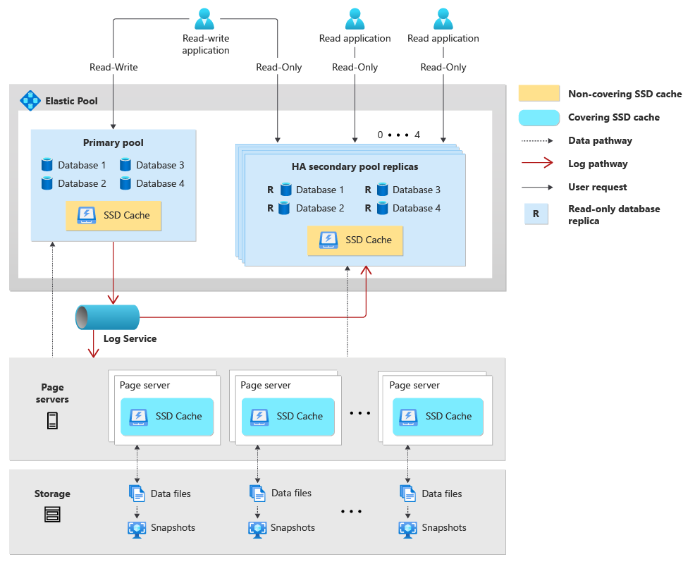 - プライマリ Elastic Pool内の Hyperscale データベースはすべて、同じログ サービスを共有します。 高可用性プール内のデータベースには書き込みワークロードがないため、ログ サービスは利用されません。