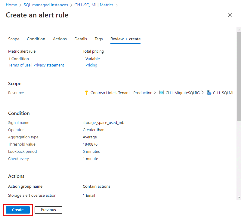 Field Description すべてのチェック 条件が満たされているかどうかアラート ルールを調べる頻度を選択します。 ルックバック期間 ルックバック期間を選択します。これは、データをチェックするたびに振り返る期間です。 たとえば、1 分ごとに過去 5 分間を調べます。 スクリーンショットに示されている例では、1,840,876 MB の値を使用して 1.8 TB のしきい値を表しています。 この例の演算子はより大きいに設定されているため、SQL Managed Instance のストレージ スペース消費量が 1.8 TB を超える場合は、アラートがトリガーされます。 ストレージ スペース メトリックのしきい値は MB で表す必要があります。