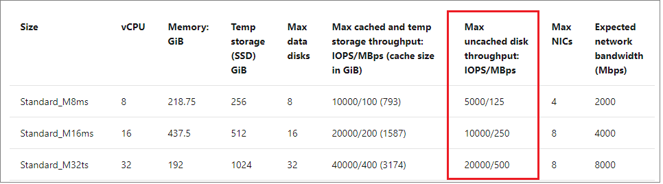 たとえば、M シリーズのドキュメントでは、Standard_M8ms VM のキャッシュ不使用時の最大スループットについては IOPS が 5,000、キャッシュ不使用時のディスク スループットが 125 MBps であることが示されています。