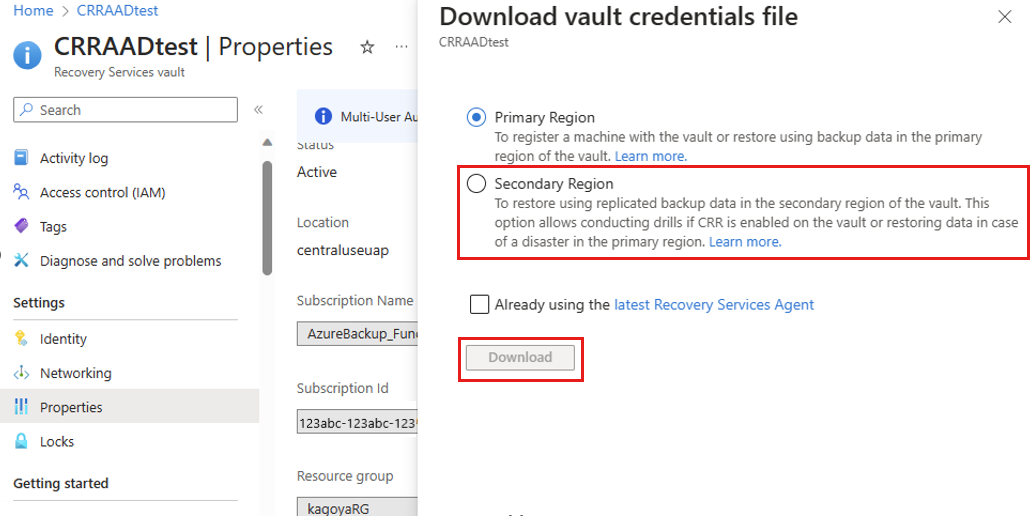 セカンダリ リージョンから代替サーバーのバックアップ データを復元するには、Azure portal から セカンダリ リージョン コンテナーの資格情報 をダウンロードする必要があります。