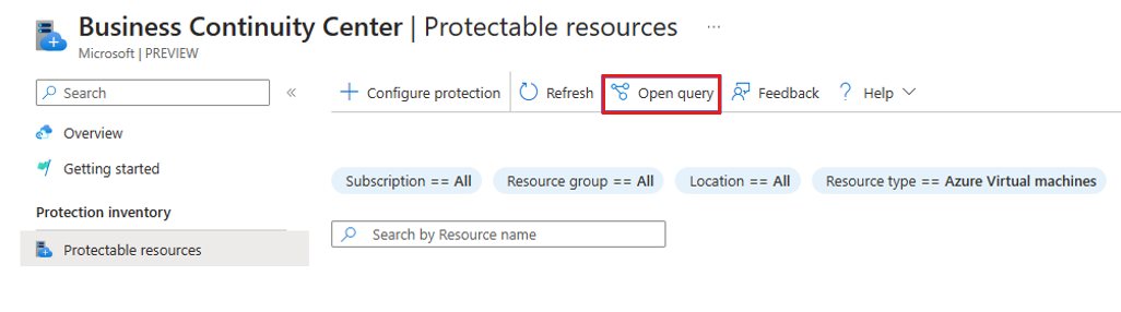 ARG を使用して保護可能な Azure リソースのクエリを開始するには、[クエリを開く] を選択して提供されるサンプル クエリを使用できます。