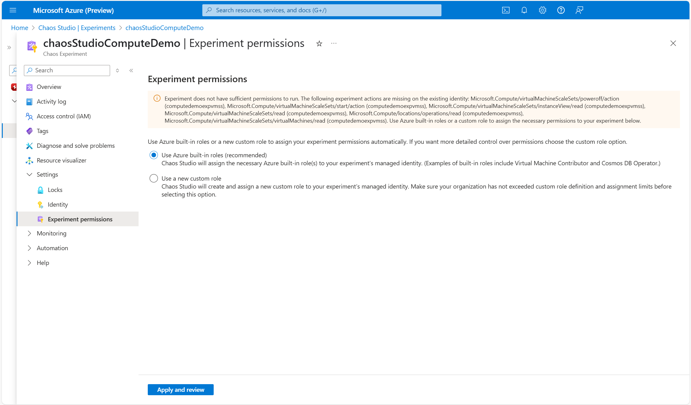 実験の概要ページの [設定] ドロップダウンにある [実験のアクセス許可] タブで、実験が実行できる十分なアクセス許可をいつでも持っているかどうかを確認できます。 実験に実行するための十分なアクセス許可がない場合は、そのマネージド ID に欠けている特定の Azure Resource Manager アクションと、各アクションが実験でマップされるターゲットが表示されます。