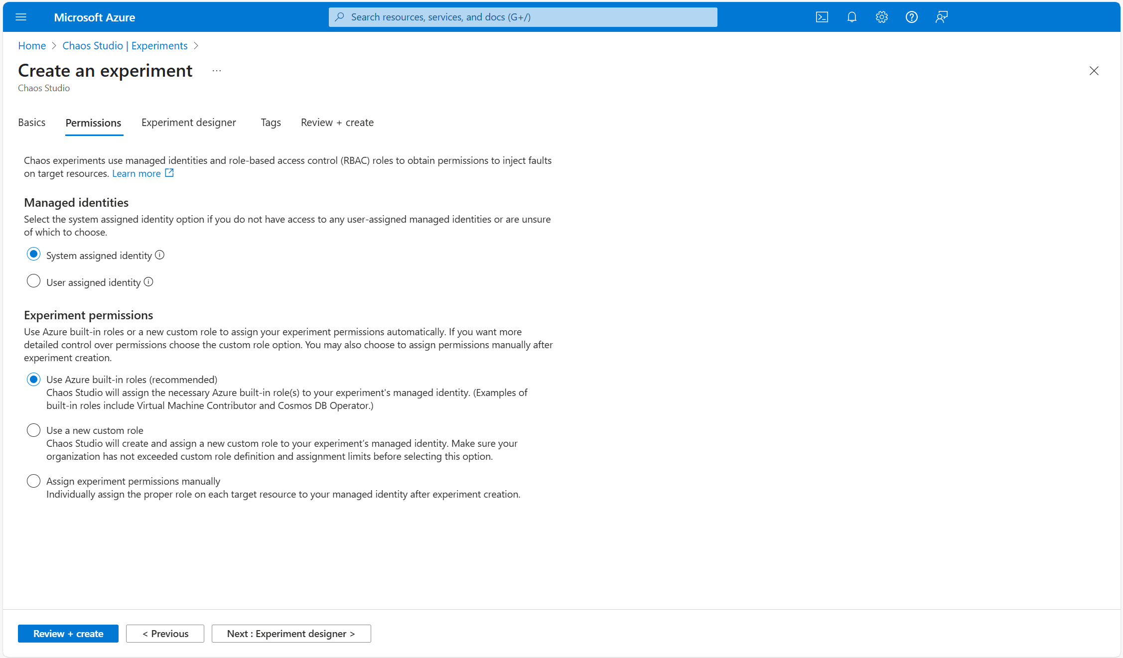 Azure portal で実験を作成するときに、[アクセス許可] タブの [実験のアクセス許可] セクションで、Azure 組み込みロール、新しいカスタム ロール、または自動ロールの割り当てを無効にして実験のアクセス許可を割り当てることを選択できます。