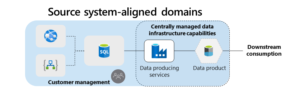 これらの消費ニーズに対応するために、データ変換と使用のために共有データ サービスを提供することを検討してください。 たとえば、データ パイプライン、ストレージ インフラストラクチャ、ストリーミング サービス、分析処理などを処理する、ドメインに依存しないデータ インフラストラクチャ機能を提供できます。