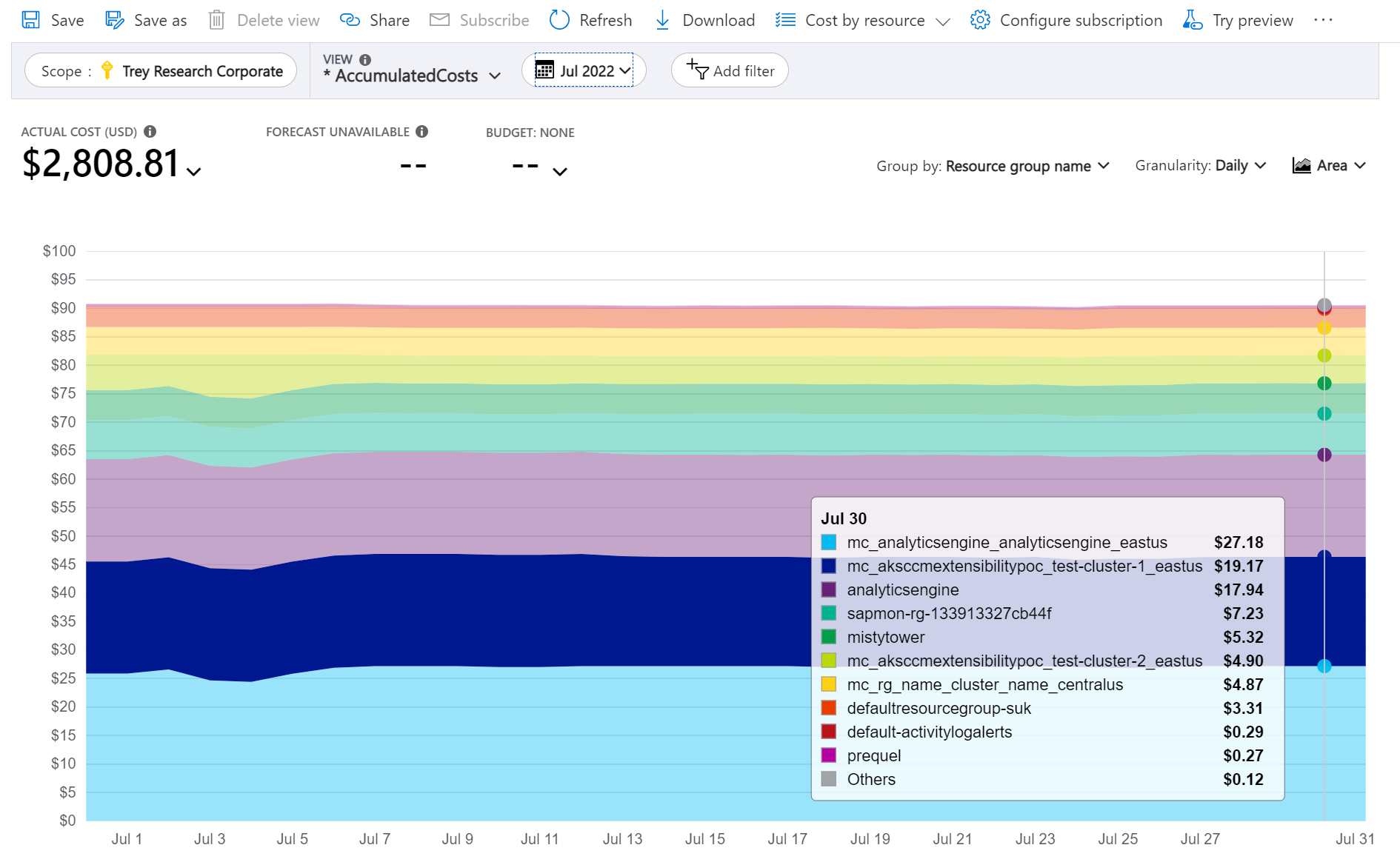 次の図では、リソース グループ名が示されています。 タグでグループ化してタグあたりの合計コストを表示したり、リソース グループ名でグループ化したりすることができます。