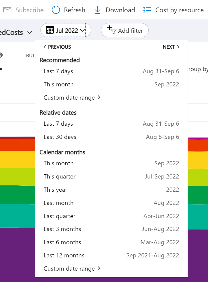 コスト分析では、現在の月のデータが既定で表示されます。 一般的な日付範囲にすばやく切り替えるには、日付セレクターを使用します。 例としては、過去 7 日間、先月、今年、またはカスタムの日付範囲があります。 従量課金制サブスクリプションには、現在の請求期間や最後の請求書のように、カレンダーの月に制約されない請求期間に基づいた日付範囲も含まれます。