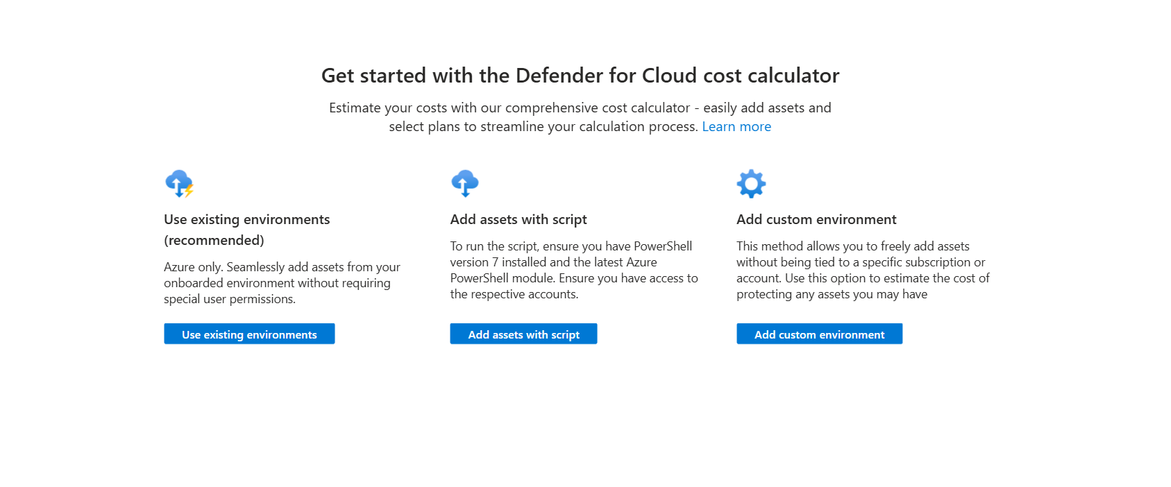 新しいコスト計算ツールを試して、その利点を確認してください。 ツールにアクセスし、保護ニーズの範囲の定義を開始します。 Defender for Cloud Cost Calculator を使用するには、 Microsoft Defender for Cloud Environment の設定 に移動し、[ コスト計算ツール ] ボタンを選択します。