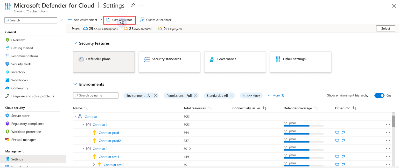 Defender for Cloud Cost Calculator を使用するには、Microsoft Defender for Cloud の [環境設定] セクションに移動します。 インターフェイスの上部セクションにある [コスト計算ツール] ボタンを選択します。