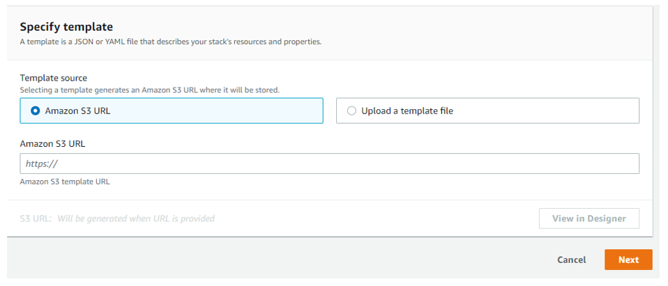 Amazon S3 URL: ダウンロードした CloudFormation テンプレートを、自分のセキュリティ構成で自分の S3 バケットにアップロードします。 AWS デプロイ ウィザードで S3 バケットの URL を入力します。