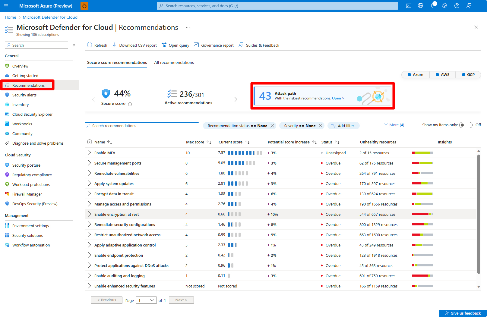 [Microsoft Defender for Cloud]>[推奨設定]>[Attack path](攻撃パス) に移動します。