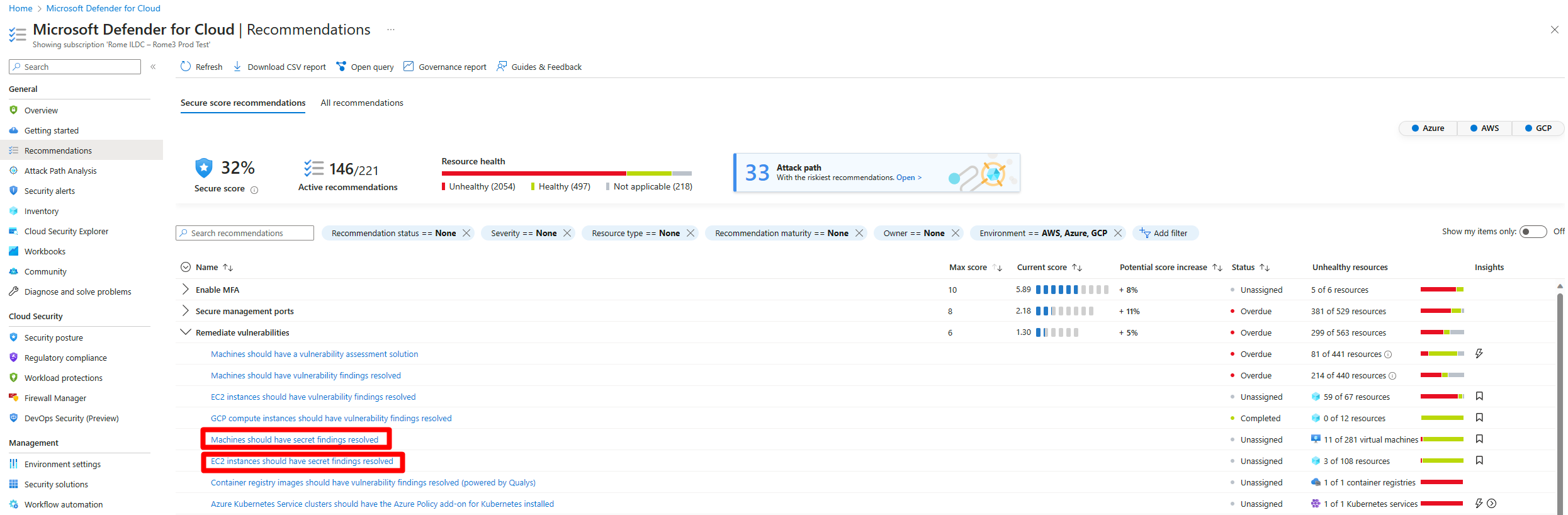 - マシン シークレットの推奨事項を使用して、結果を確認および修復できます。