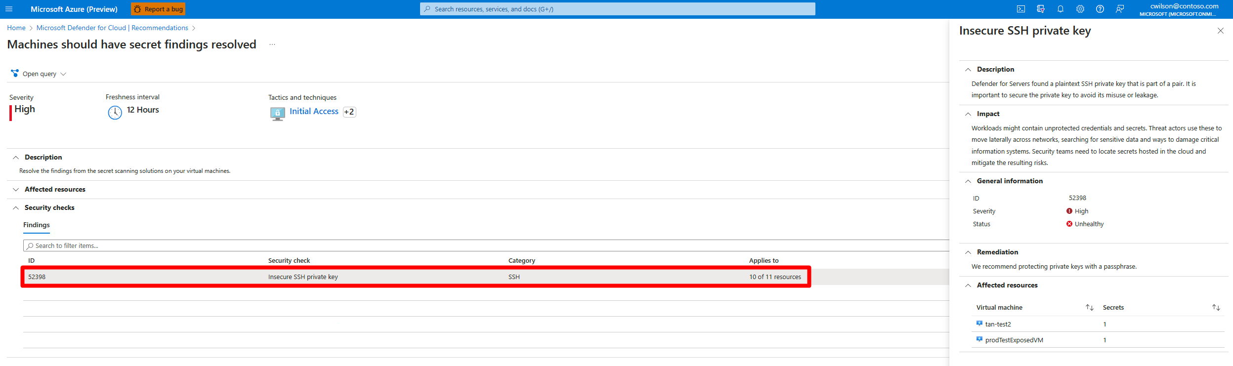 - シークレット メタデータとクラウド アセット コンテキストの組み合わせ。 これにより、インターネットに公開されている資産や、他の機密性の高い資産を危険にさらす可能性のあるシークレットを含む資産に最初に取り組むことができます。 シークレット スキャンの結果は、リスクベースの推奨事項の優先順位付けに組み込まれます。