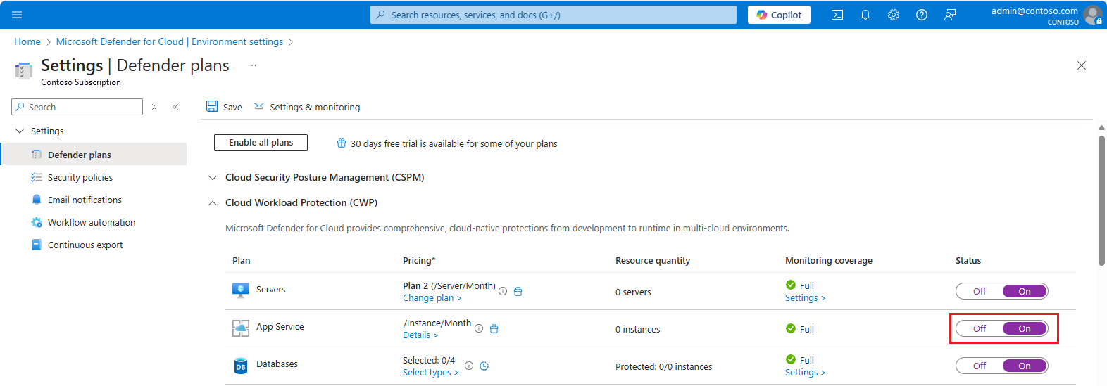 [Defender プラン] ページで、[App Service プラン] を [オン] に切り替えます。
