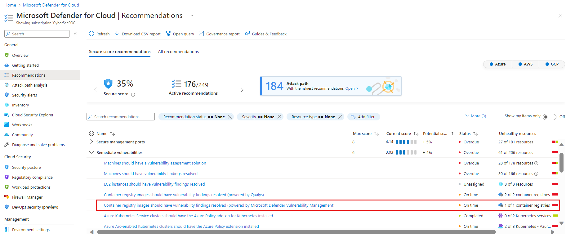[推奨事項] ページを開きます。 問題が見つかった場合は、推奨事項コンテナーのレジストリ イメージは、脆弱性の調査結果が解決されている必要があります (Powered by MDVM) が表示されます。 レコメンデーションを選択します。