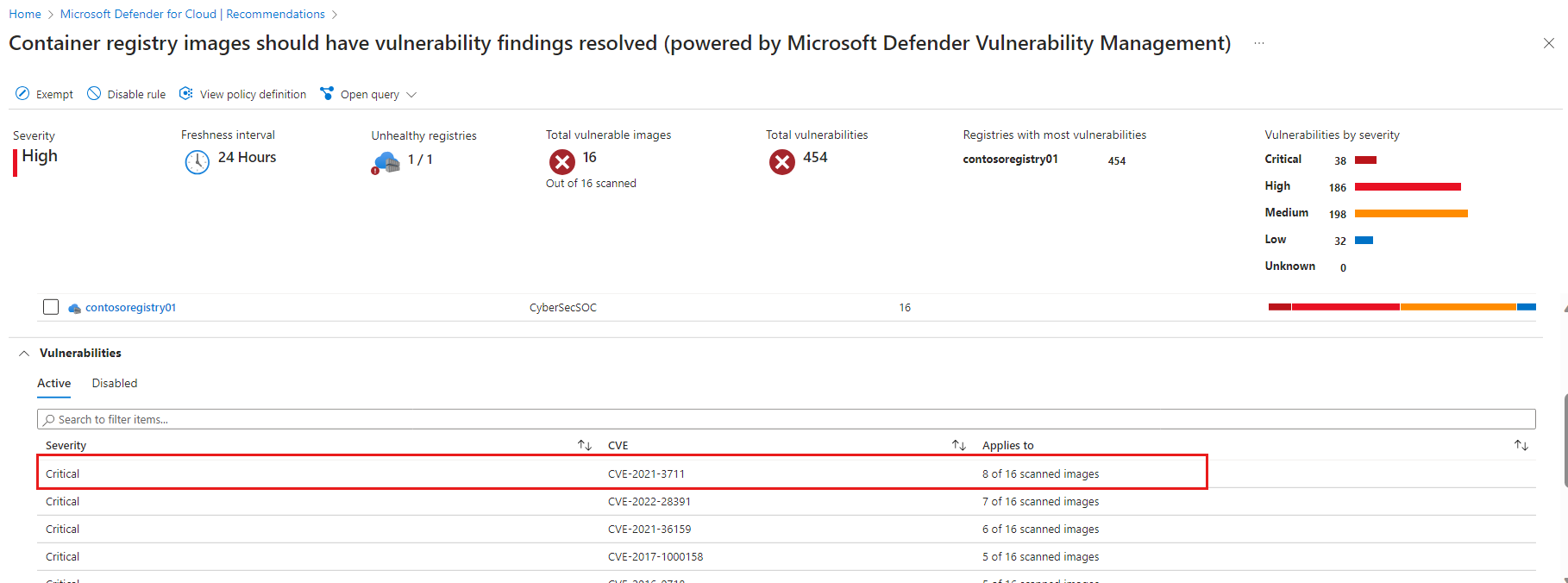 推奨事項の詳細ページには、画像に影響を与える脆弱性の一覧などの追加情報が含まれています。
