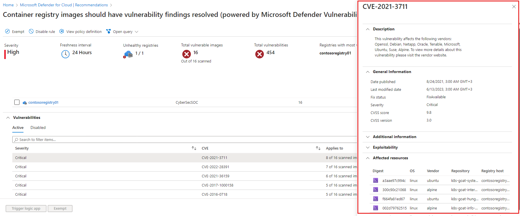 脆弱性検出の詳細ウィンドウには、脆弱性の詳細な説明、その脆弱性の影響を受ける画像、および脅威の軽減に役立つ外部リソースへのリンク、影響を受けるリソース、および脆弱性の解決に役立つソフトウェア バージョンに関する情報 が含まれています。
