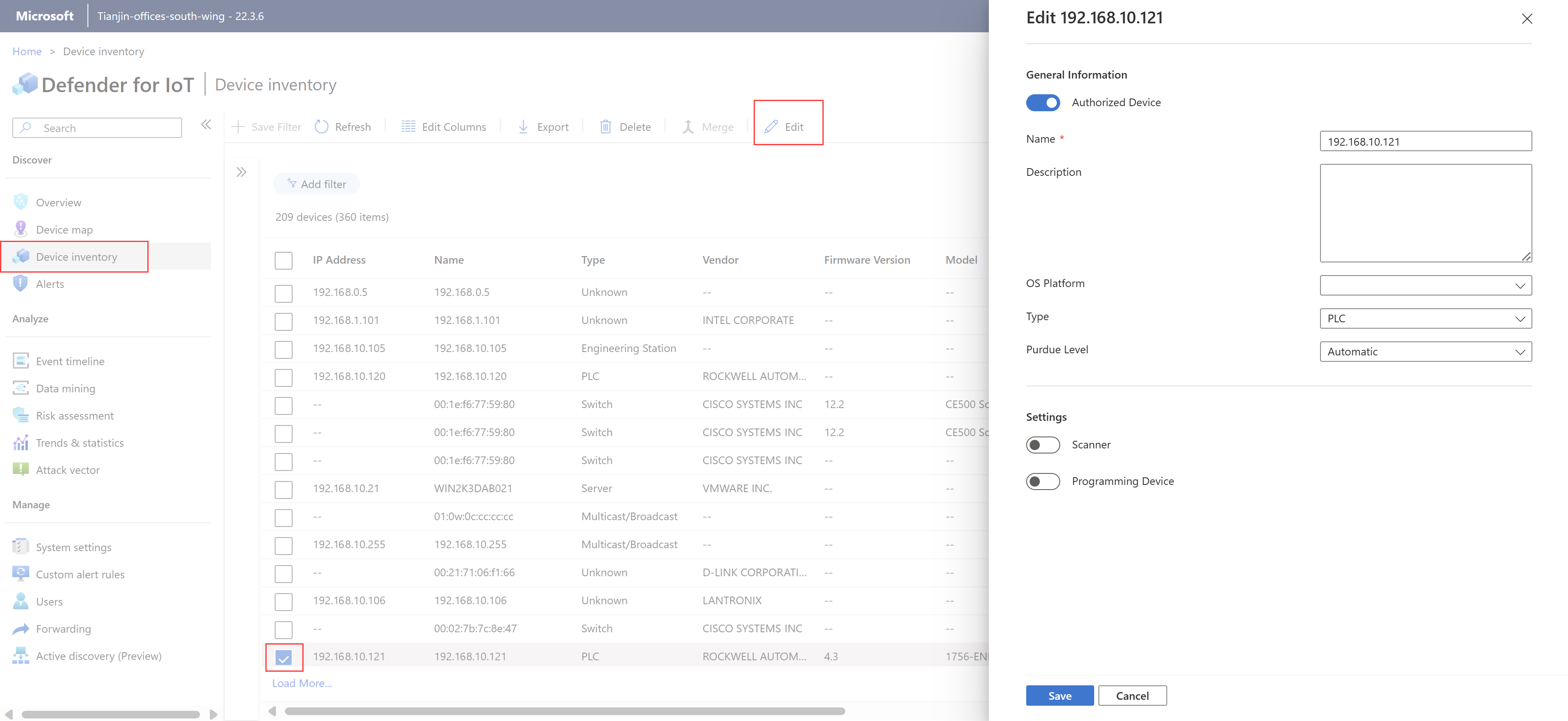 名前 説明 認可されているデバイス デバイスがネットワーク上の既知のエンティティである場合に選択します。 Defender for IoT は、認可済みのデバイスで検出されたトラフィックに対するアラートをトリガーしません。 名前 既定では、デバイスの IP アドレスとして表示されます。 必要に応じて、デバイスのわかりやすい名前に更新してください。 説明 既定では空白のままになります。 必要に応じて、デバイスのわかりやすい説明を入力してください。 OS プラットフォーム オペレーティング システムの値の検出がブロックされている場合は、ドロップダウン リストからデバイスのオペレーティング システムを選択します。 タイプ デバイスの種類の検出がブロックされているか、変更する必要がある場合は、ドロップダウン リストからデバイスの種類を選択します。 詳しくは、「サポートされるデバイス」をご覧ください。 Purdue レベル デバイスの Purdue レベルが [未定義] または [自動] であると検出された場合は、別のレベルを選択してデータを微調整することをお勧めします。 詳細については、「OT センサーをネットワークに配置する」を参照してください。 スキャナー デバイスがスキャン デバイスである場合に選択します。 Defender for IoT は、スキャン デバイスとして定義されているデバイスで検出されたスキャン アクティビティのアラートをトリガーしません。 プログラミング デバイス デバイスがプログラミング デバイスである場合に選択します。 Defender for IoT は、プログラミング デバイスとして定義されているデバイスで検出されたプログラミング アクティビティに対するアラートをトリガーしません。 [保存] を選択して変更を保存します。