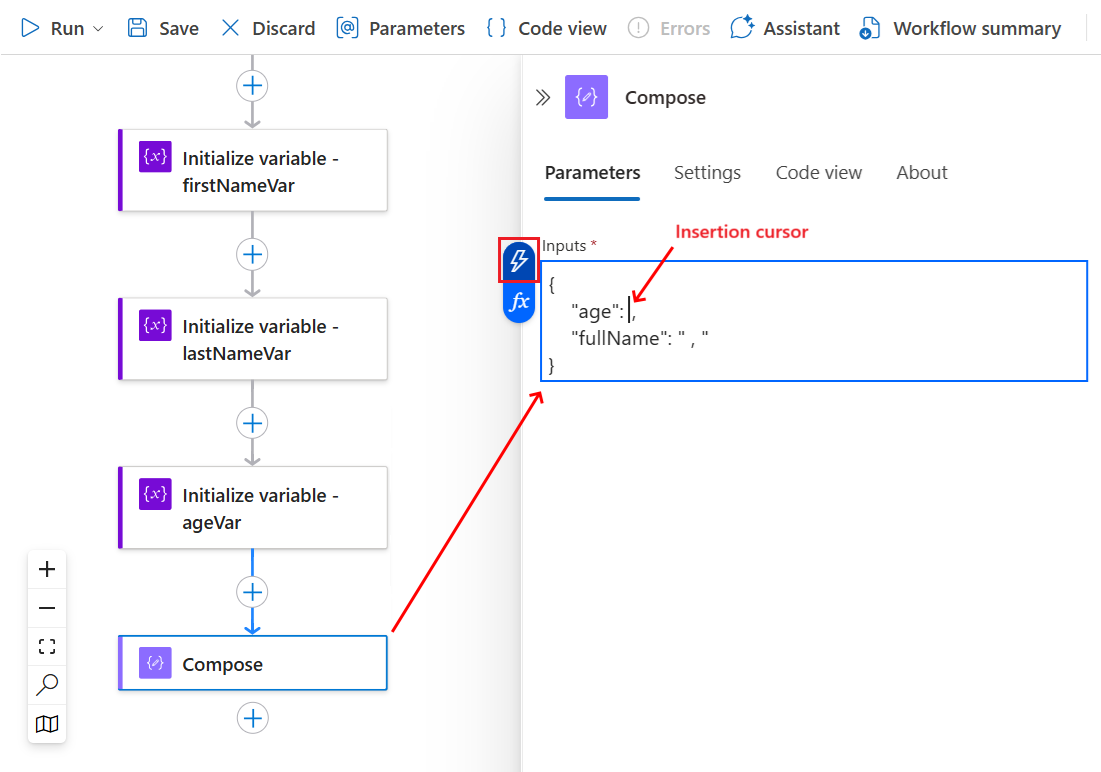 作成 | さまざまなデータ型を含むことができる複数の入力からメッセージまたは文字列を作成します。 その後は、同じ入力を繰り返し入力するのではなく、この文字列を 1 つの入力として使用できます。 たとえば、さまざまな入力から 1 つの JSON メッセージを作成できます。 |