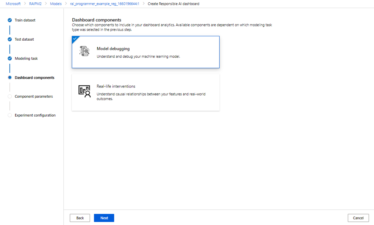 ウィザードに用意されたインターフェイスを使用すると、コードに触れることなく、責任ある AI ダッシュボードを作成するために必要なすべてのパラメーターを入力できます。 このエクスペリエンスは、Azure Machine Learning スタジオの UI ですべてが行われます。 スタジオには、どの責任ある AI コンポーネントでダッシュボードを設定するべきかに関するさまざまな選択肢のコンテキストを確認するのに役立つ、ガイド付きフローと指示テキストが表示されます。
