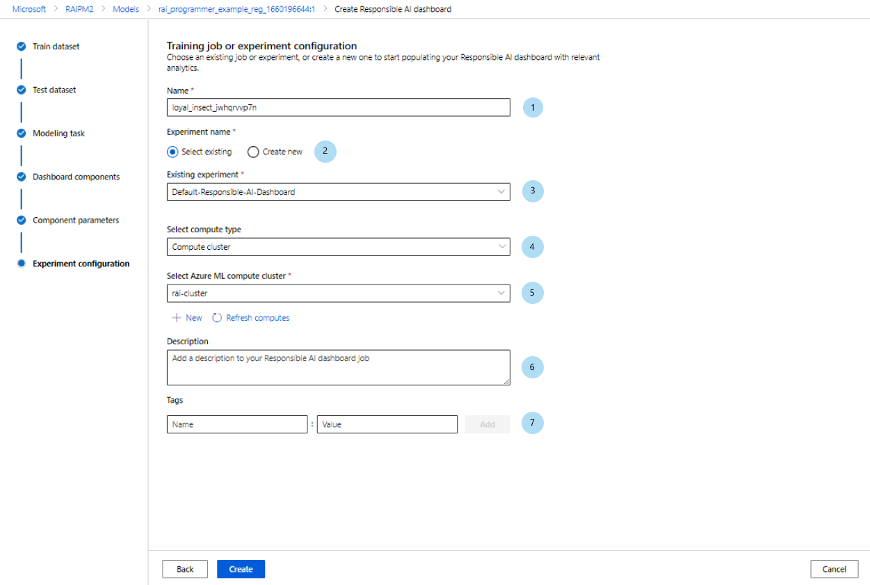 最後に、責任ある AI ダッシュボードを生成するジョブを開始するように実験を構成します。
