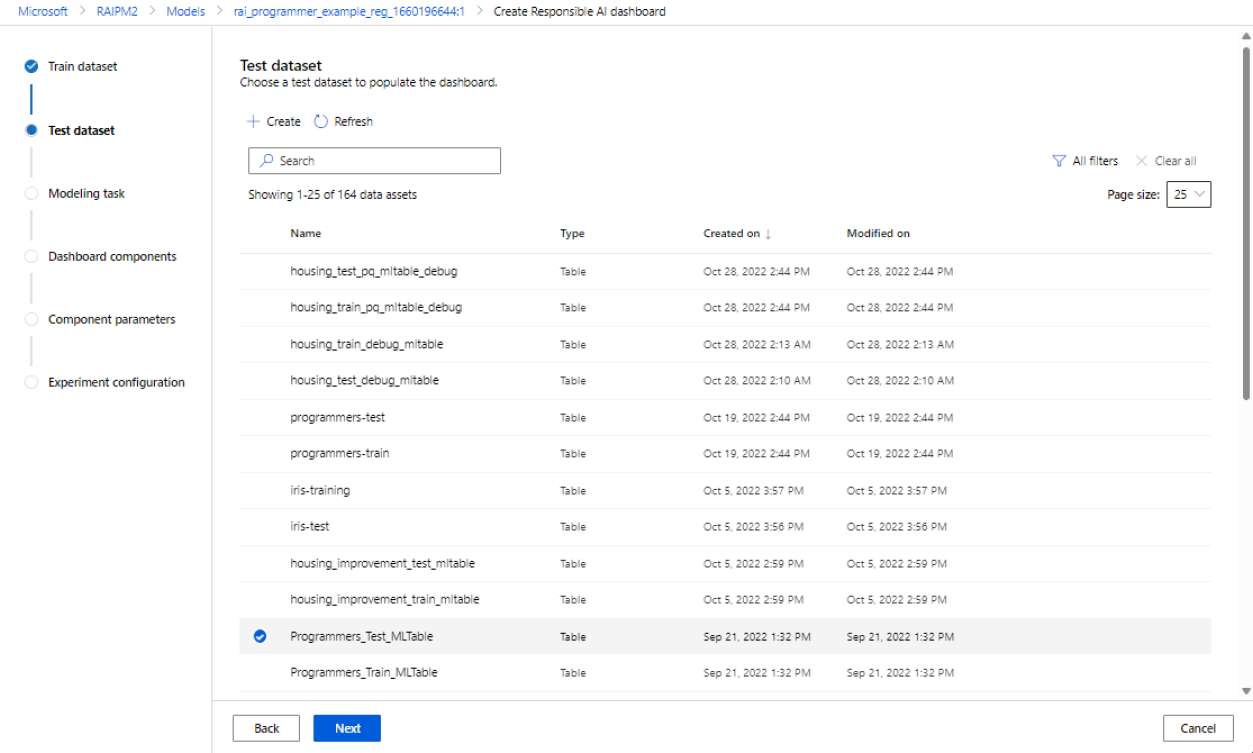 [テスト用のデータセットの選択]: 登録されたデータセットのリストで、責任ある AI ダッシュボードの視覚化を事前設定するために使用するデータセットを選択します。