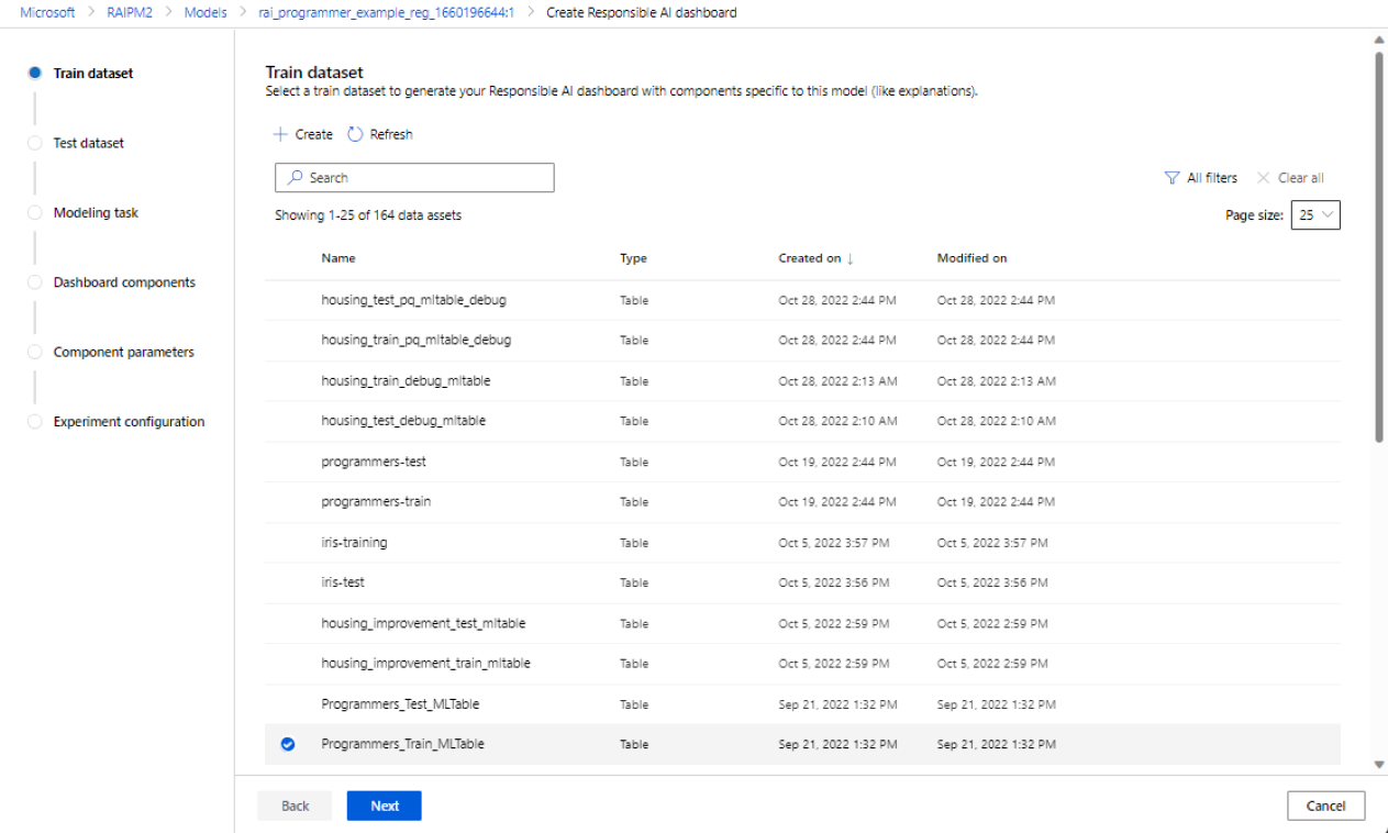 [トレーニング用のデータセットの選択]: Azure Machine Learning ワークスペースの登録済みデータセットのリストで、モデルの説明やエラー分析などのコンポーネントに対する責任ある AI の分析情報を生成するために使用するデータセットを選択します。