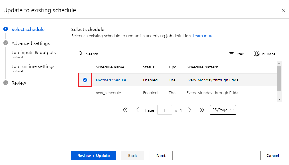 スケジュールによってトリガーされるジョブの構成をテスト ジョブとは違うものにしたい場合があります。 既存のジョブを使用してスケジュールを定義する場合は、ジョブ設定を変更できます。 この方法では、異なる入力を持つ同じジョブを使用して複数のスケジュールを定義できます。