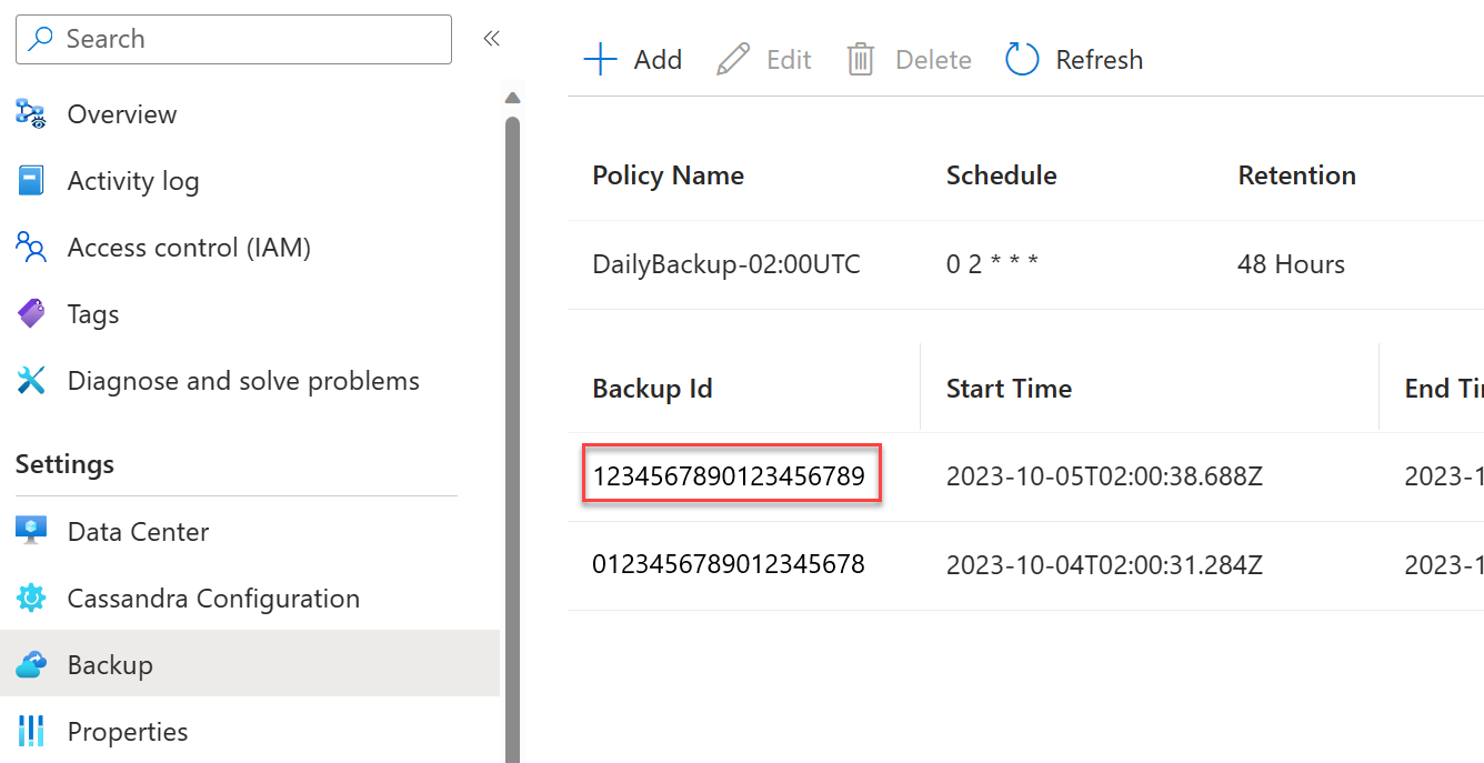 復元するバックアップのバックアップ ID をポータルから指定します。 この ID は Azure portal で確認できます。