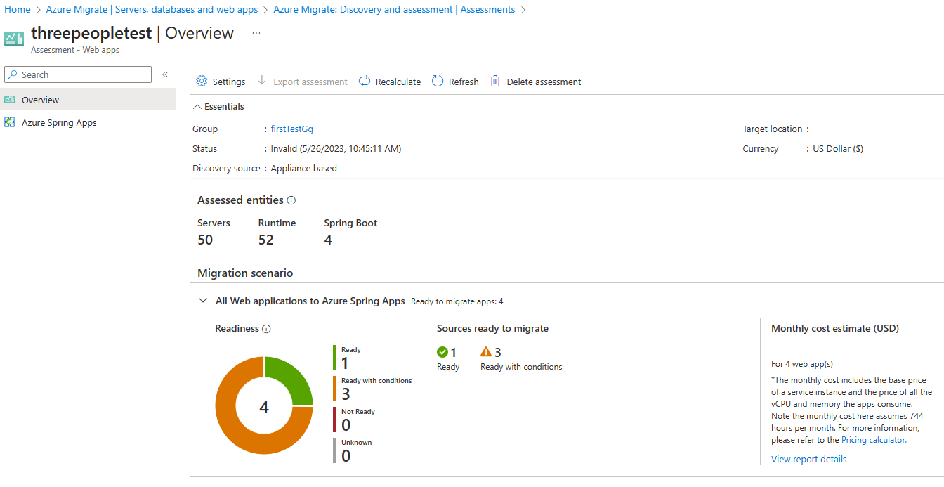 - [サーバー、データベース、Web アプリ]>[Azure Migrate: 検出および評価] で、Azure Spring Apps の評価の横にある数字を選択します。