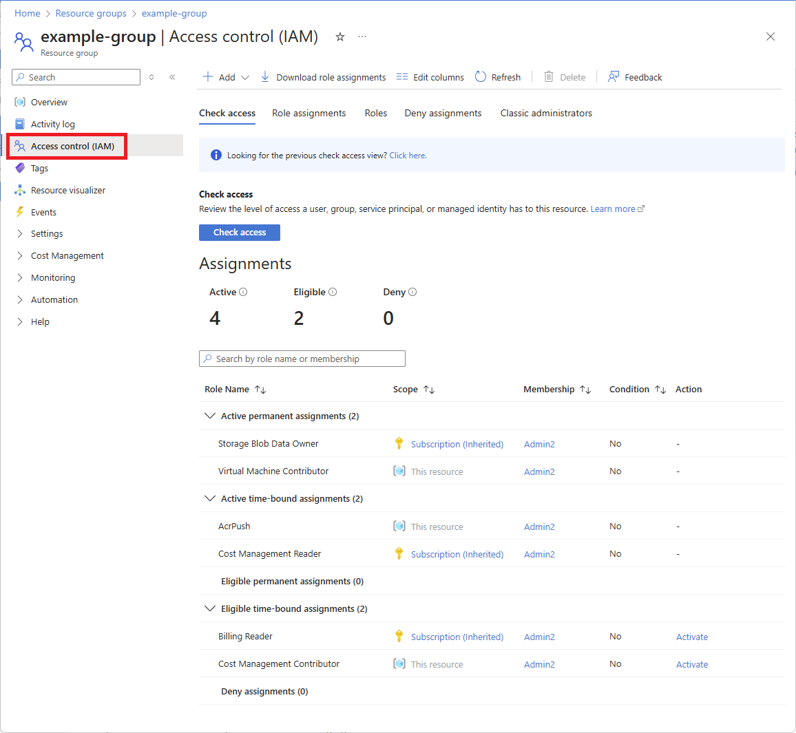 資格のある、または期限付きロールの割り当てがある場合、それらの割り当ては、[割り当て] タブで確認できます。