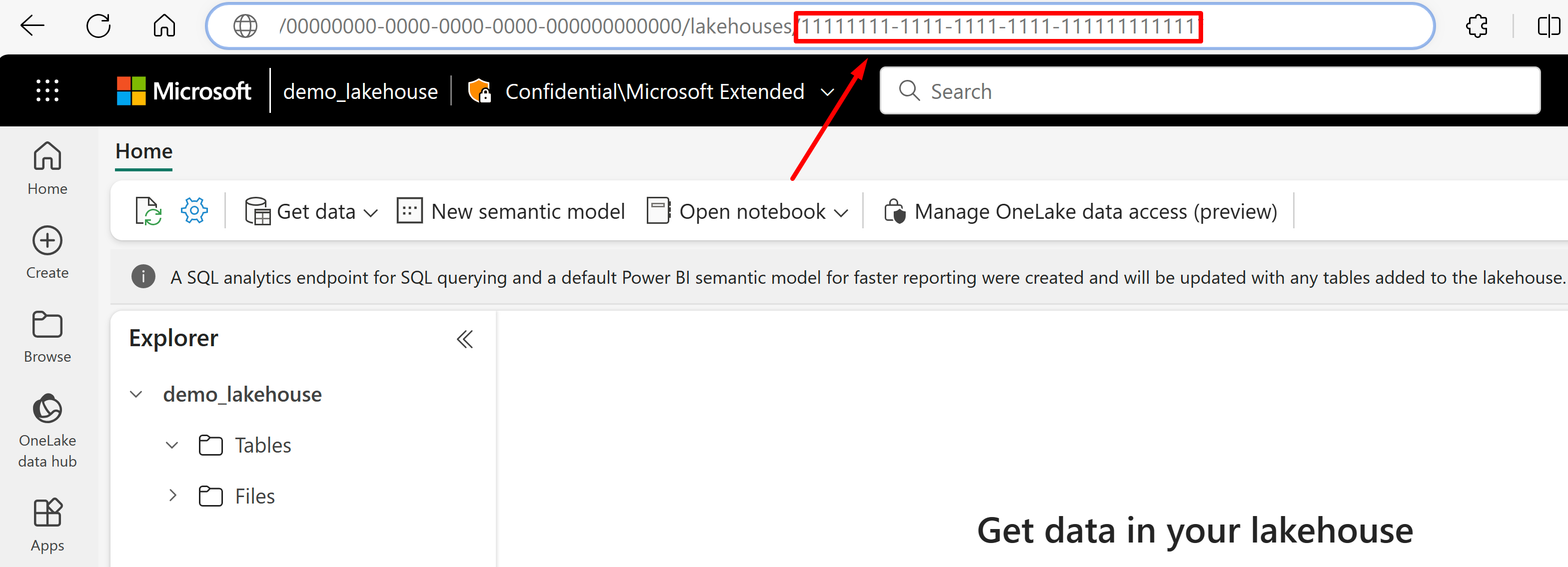 "type"を"onelake"に設定します (必須)。Microsoft Fabric ワークスペース GUID とレイクハウス GUID を取得します。