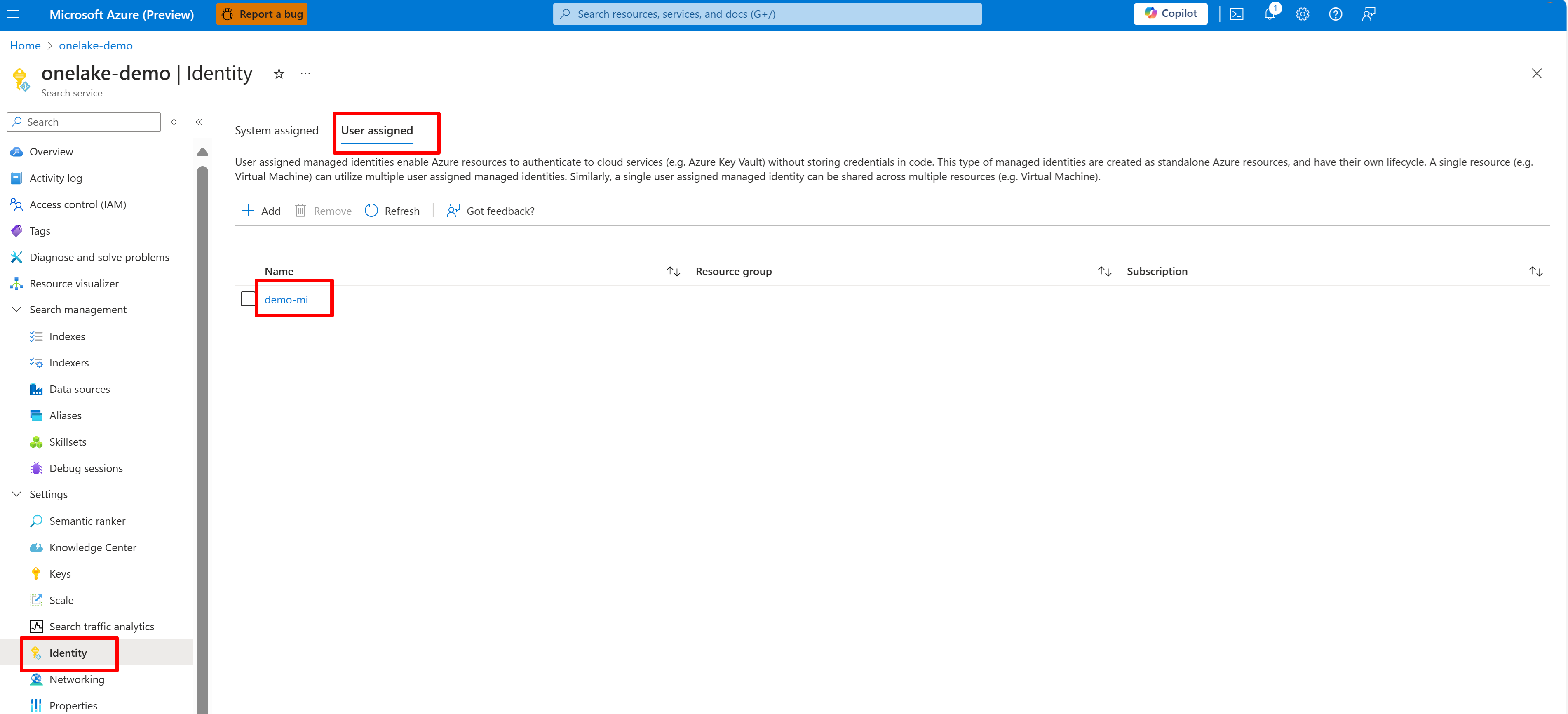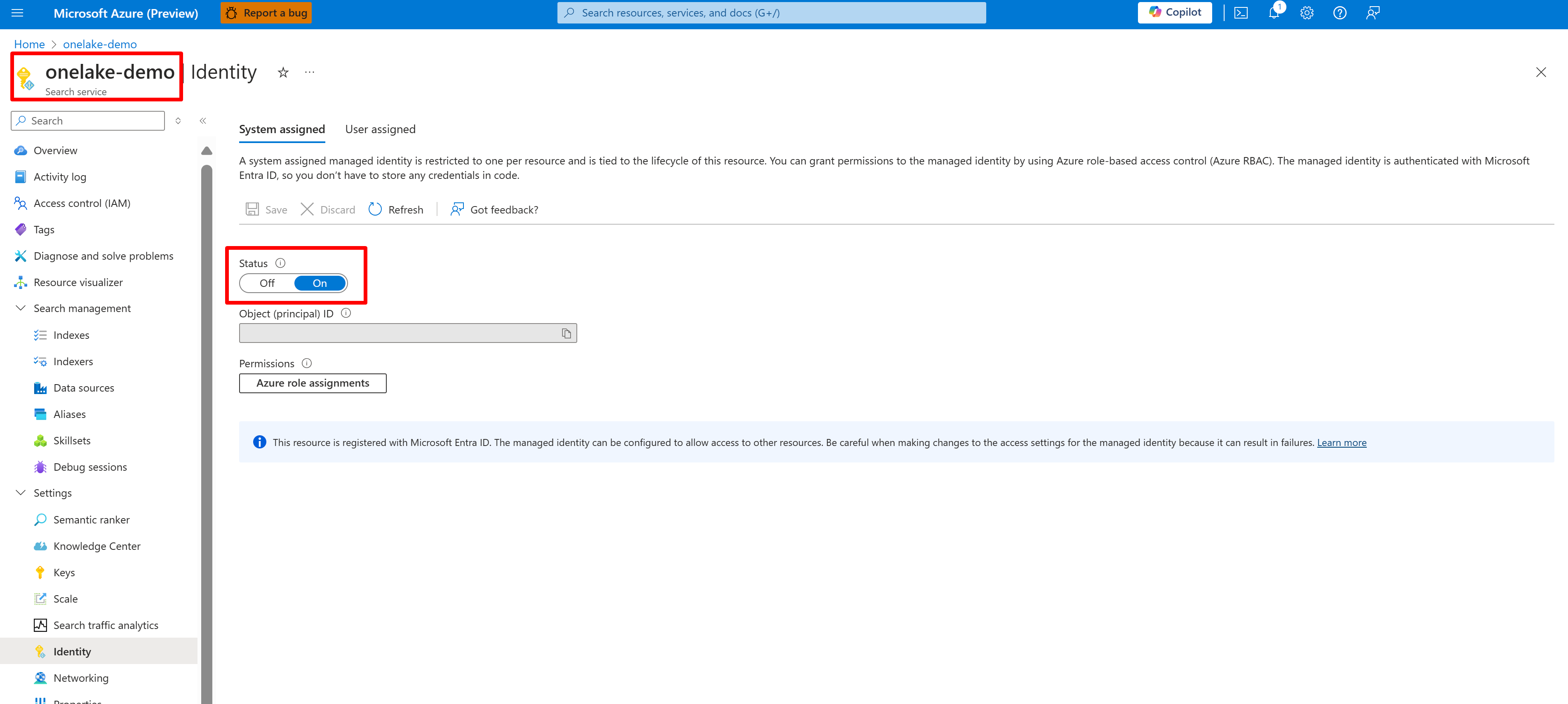 次のスクリーンショットは、"onelake-demo" という名前の検索サービスのシステム マネージド ID を示しています。