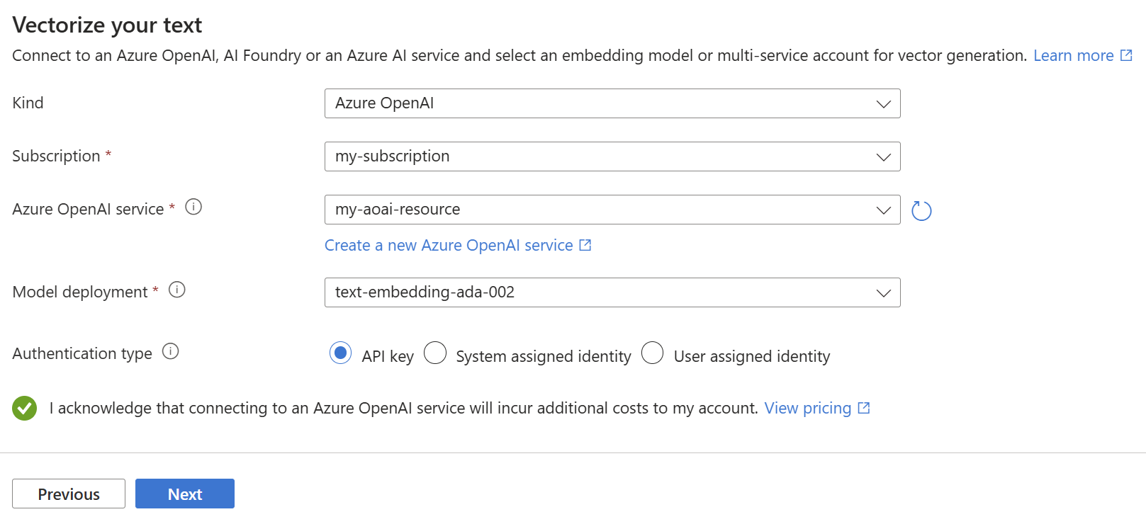埋め込みモデルを使用するためのアクセス許可。 Azure OpenAI では、呼び出し元が Cognitive Services OpenAI ユーザー アクセス許可を持っている必要があります。 または、API キーを指定することもできます。