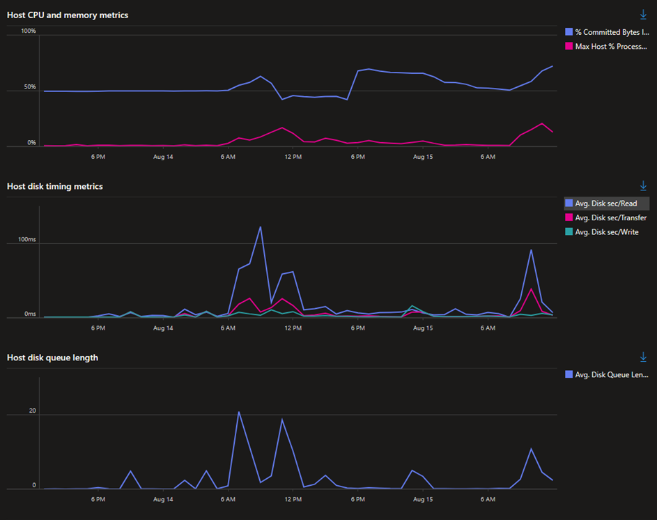 予想よりも長いユーザー入力遅延 (> 100 ミリ秒) が見つかる場合は、セッション ホストの CPU、メモリ、ディスク アクティビティの集計統計を調べて、予想より高い使用率の期間があるかどうかを確認すると便利です。 ホスト CPU とメモリのメトリック、ホスト ディスクのタイミング メトリック、ホスト ディスク キューの長さのグラフには、セッション ホスト全体の集計か、選択したセッション ホストのリソース メトリックが表示されます。