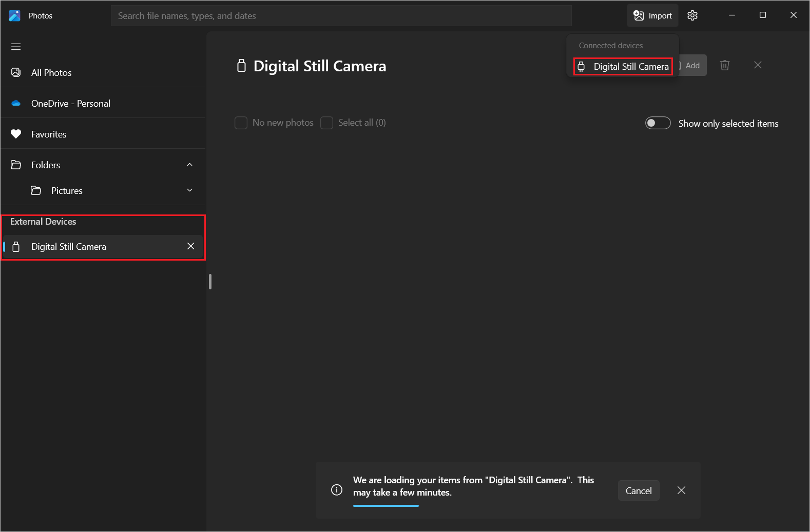 スタート メニューからリモート セッションで フォト アプリ (Microsoft から) を開きます。 [インポート] を選択チェック、リダイレクトされたデバイスが接続されているデバイスの一覧に表示されます。