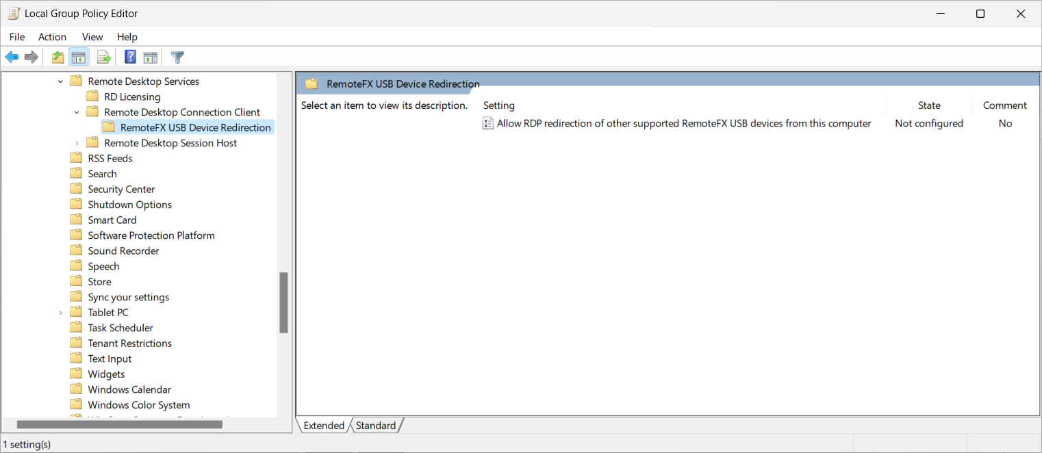 不透明な低レベルリダイレクトを使用してローカル Windows デバイスを USB リダイレクト用に構成するには、ユーザーと管理者に対してサポートされている他の USB 周辺機器の RDP リダイレクトを許可する必要があります。 これを行うには、グループ ポリシーを使用します。