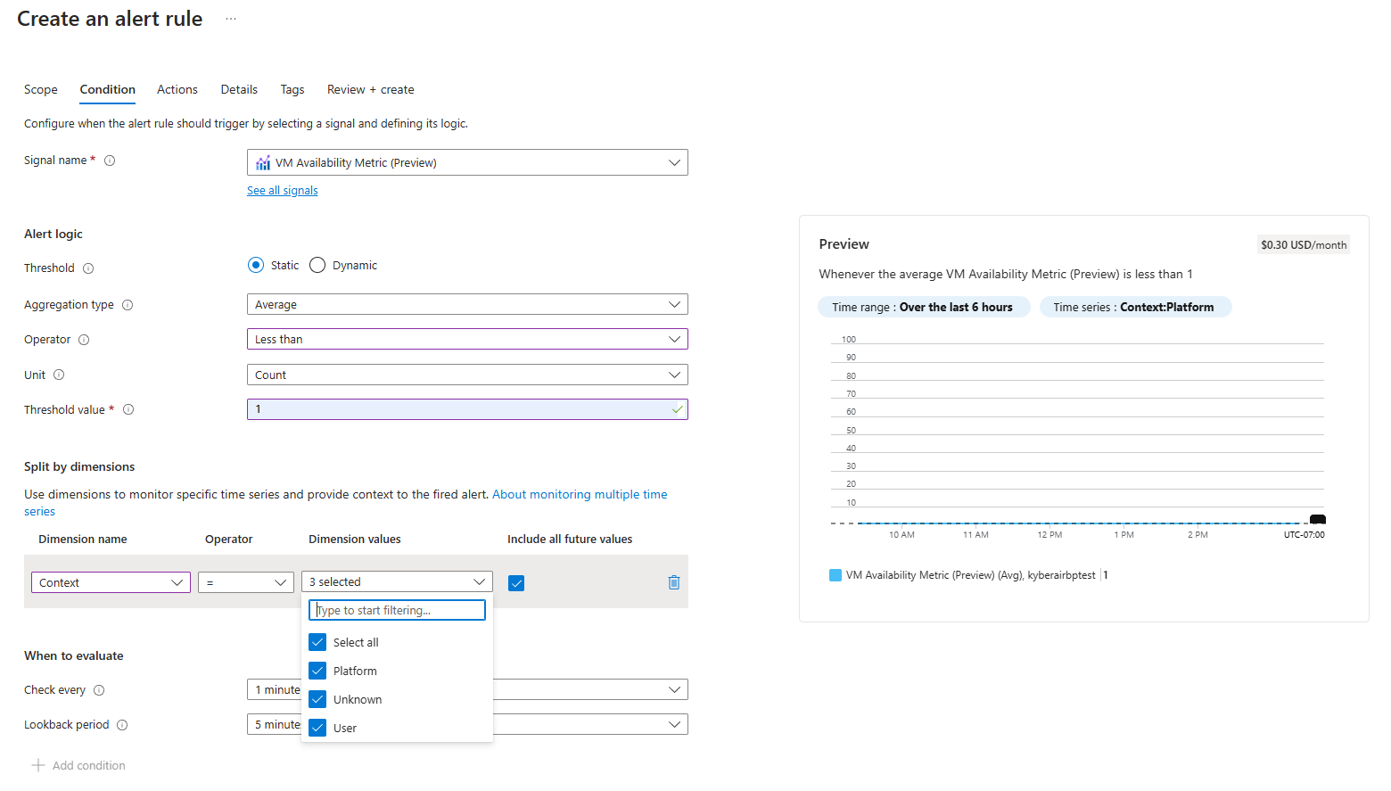 ユーザーは、ディメンション値に基づいてアラート ルールを作成できます。 [条件] タブで、[シグナル名] として [VM 可用性メトリック] を選択します。 [ディメンションで分割] セクションで、ディメンション名として「Context」と入力し、対応するディメンション値を選択します。