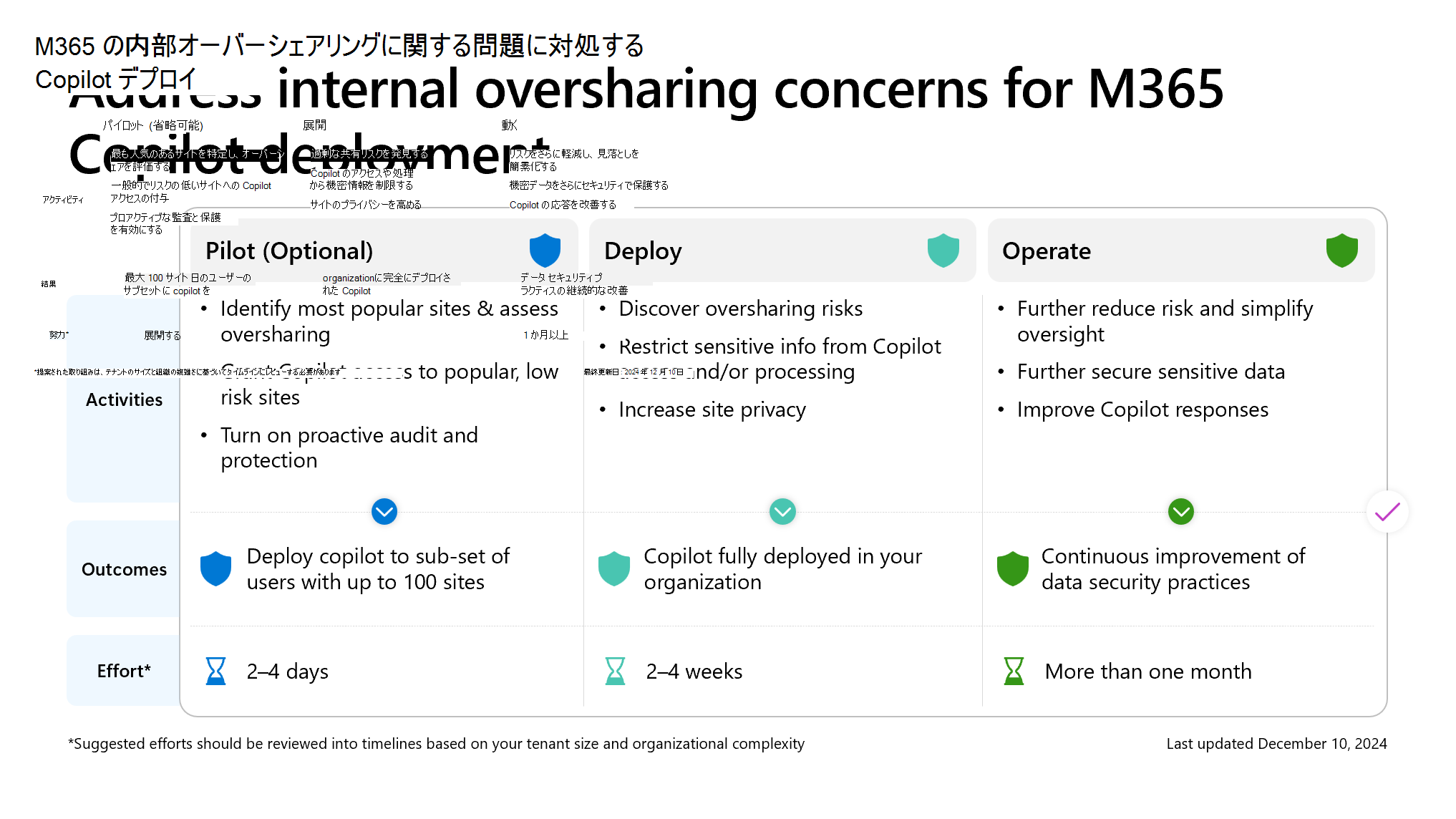 - Microsoft 365 Copilotデプロイでの過剰な共有を避けるために推奨される段階的なアプローチ