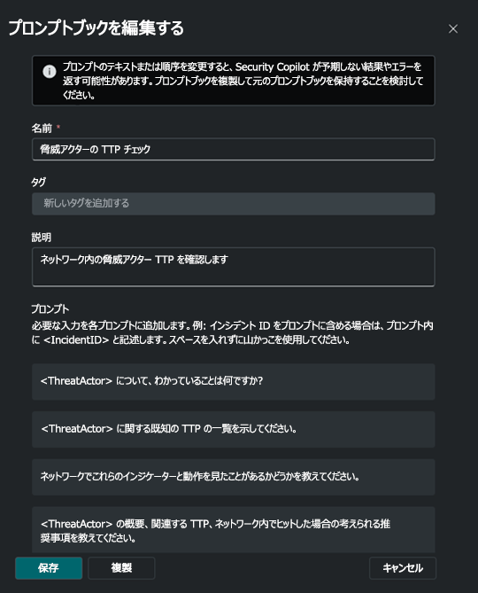 プロンプトブックの名前、タグ、説明、プロンプトの詳細、パラメーターの入力などを、プロンプトの順序を含めて編集できます。