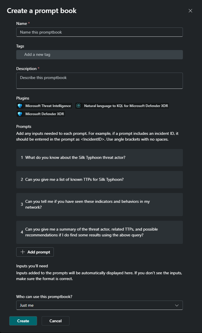 セキュリティ ワークフローのSecurity Copilotと対話する過程で、異なるエンティティに対して同じ一連のプロンプトを定期的に実行することに気付く場合があります。 これは、必要に応じてパラメーターを指定できる独自のプロンプトブックを作成する良い機会です。