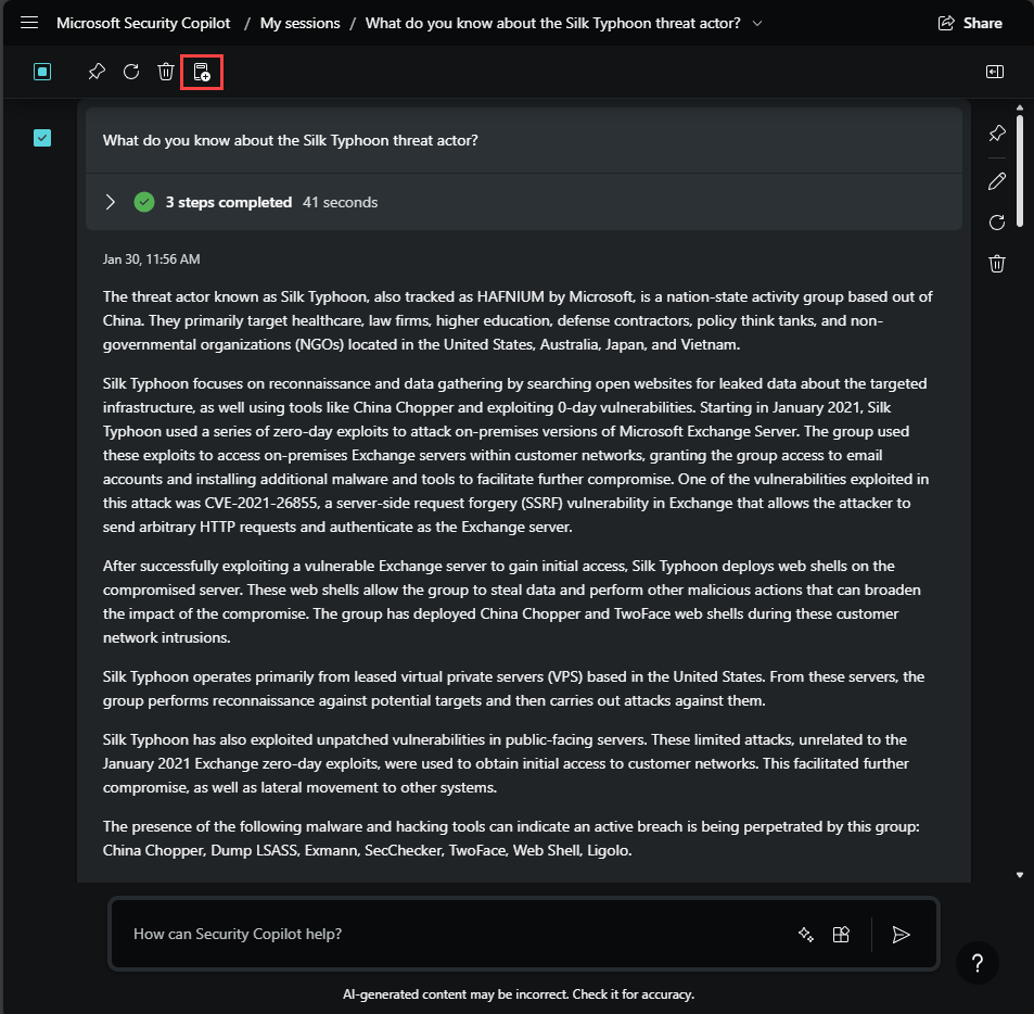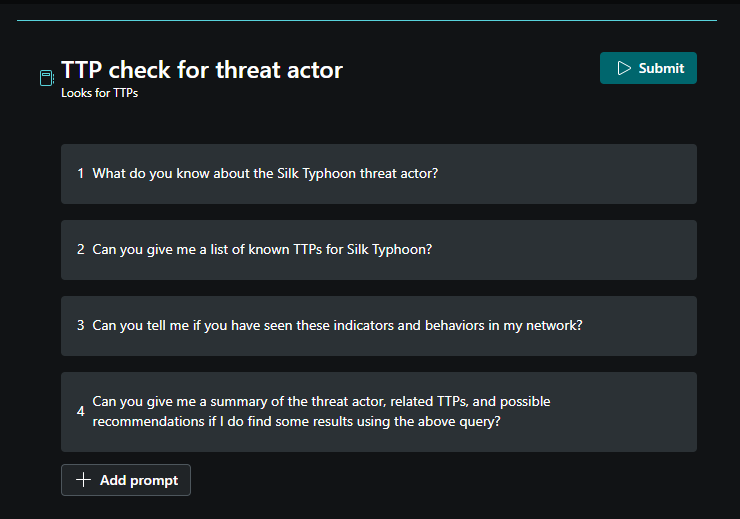 Microsoft Security Copilotのプロンプトブックには、特定のセキュリティ関連のタスクを実行するために一緒に作成された 1 つ以上のプロンプトが含まれています。 プロンプトは 1 つずつ実行され、以前の応答に基づいてビルドされます。