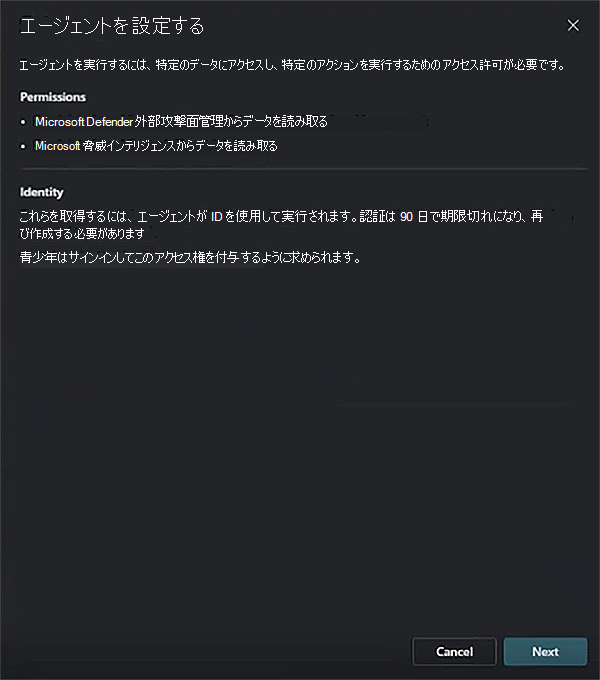 ID とアクセス許可の要件: このエージェントには、既存のユーザー アカウントへの接続が必要です。 エージェントは、Defender 外部攻撃面管理とDefender 脆弱性の管理からデータを読み取ることができます。 エージェントを設定する前に、以下で説明する適切なアクセス許可を使用してユーザー アカウントを構成する必要があります。