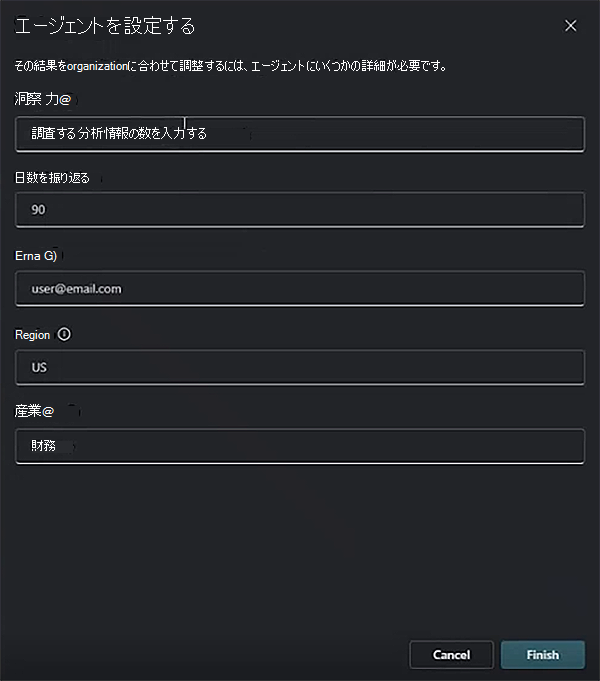 出力をカスタマイズするパラメーターを指定し、[完了] を選択 します。 これらのパラメーターは、エージェントの概要ページの右上セクションで 3 つのドットを選択することで後で編集できます。