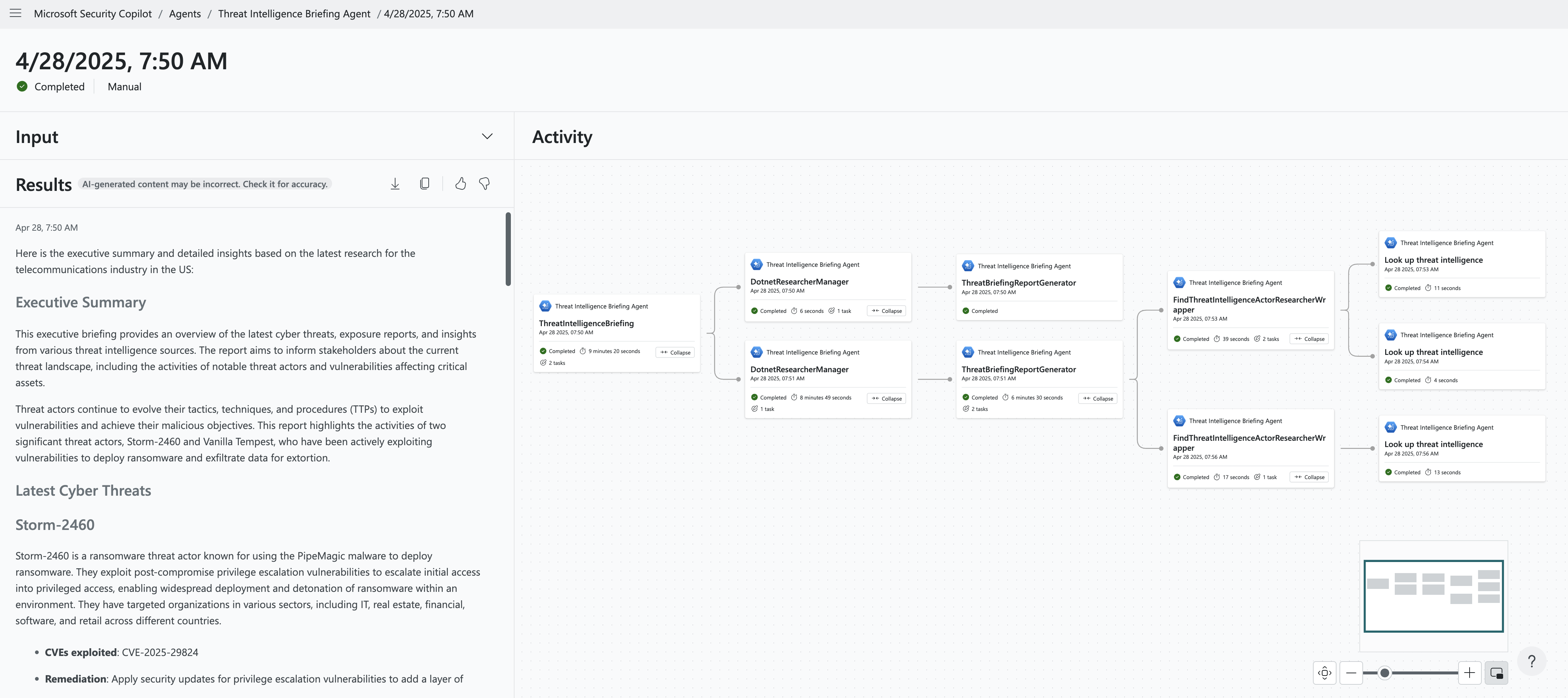 このエージェントは、動的自動化と深いジェネレーティブ AI と、豊富な脅威インテリジェンスの知識とシグナルを活用します。 ブリーフィングを構築するときに、エージェントは前の手順の結果に基づいて次のステップを動的に選択し、どの脅威インテリジェンスを含めて優先順位を付けるかをリアルタイムで決定できるようにします。 エージェントは、この技術情報を、さまざまな対象ユーザーが使用できる消化可能なレポートに変換します。