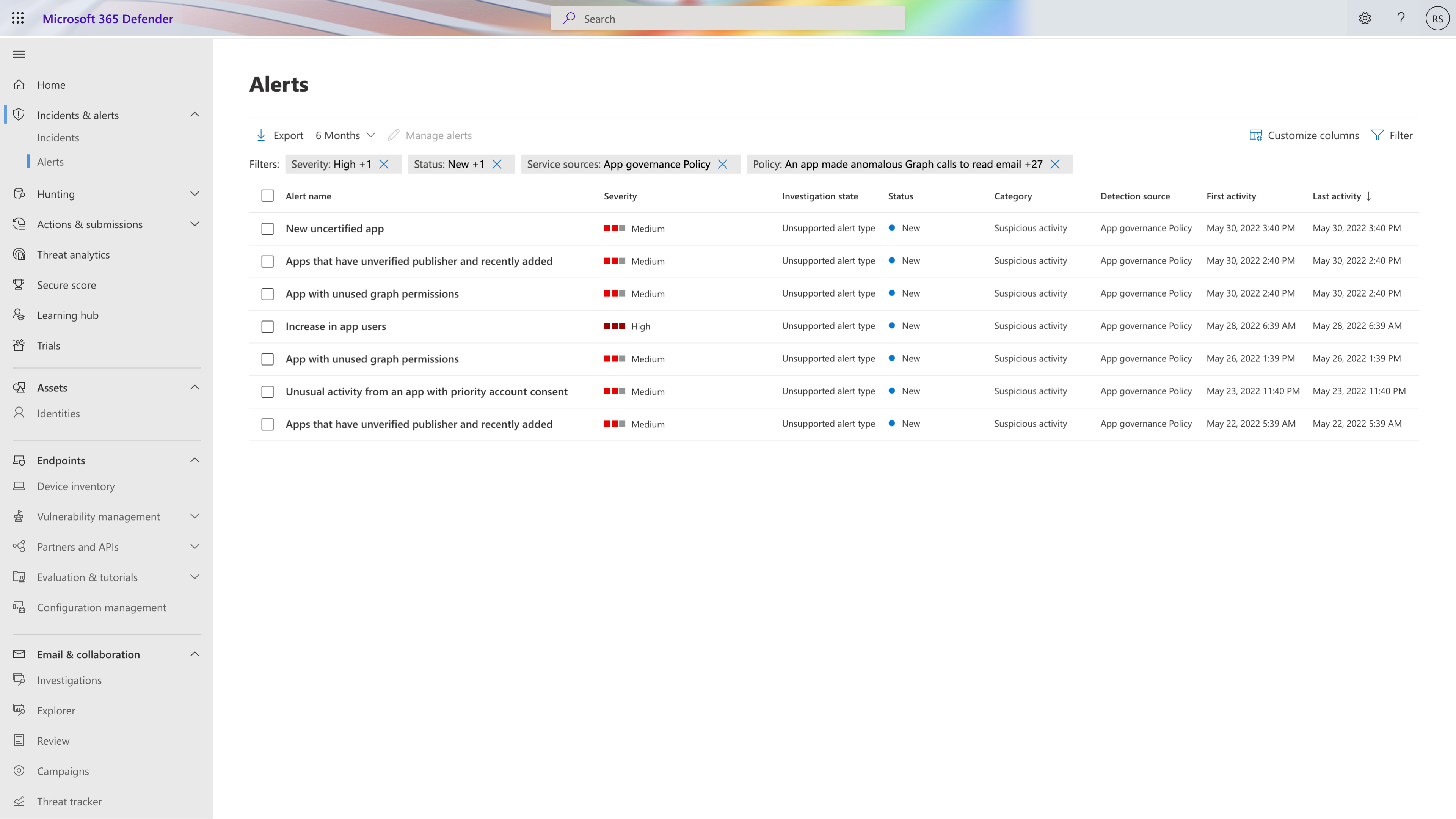 アプリ ガバナンス アラートが、他のすべてのMicrosoft Defender XDRアラートと共に一覧表示されるようになりました。 それらを見つけるには、サービス ソースとして "アプリ ガバナンス" をフィルター処理します。