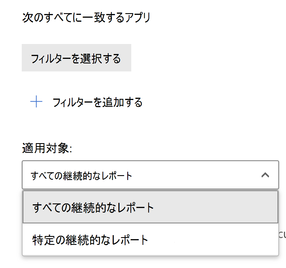 アプリ検出ポリシーを構成し、[ Apply to > All continuous reports]\(すべての継続的なレポートに適用\) を選択すると、検出ストリームごとに複数のアラートが生成されます。これには、すべてのソースからのデータを集計するグローバル ストリームが含まれます。 アラートの量を制御するには、[ 特定の継続的なレポート > に適用 する] を選択し、ポリシーに関連するストリームのみを選択します。 詳細情報: Defender for Cloud アプリの継続的なリスク評価レポート