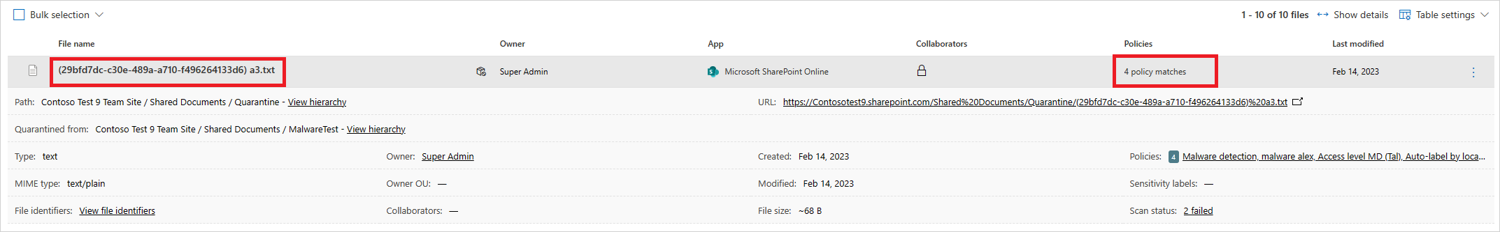 • Defender for Cloud Apps - スキャンするファイルに関するより多くの分析情報を提供します。 DEFENDER FOR CLOUD APPS DLP によってスキャンされた各ファイルについて、ファイルが暗号化されているか破損しているために検査がブロックされたかどうかを確認できます。 たとえば、外部で共有されているパスワードで保護されたファイルを警告および検疫するポリシーを設定できます。
